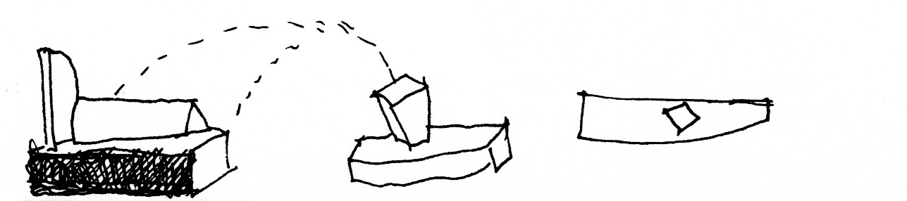 A hollow charcoal cube is warped by distorting forces opening a triangle of light from above. This cubic wooden structure is linked by an exoskeletal steel “L” to an existing stone “U”. The link, like a porch, is a temperate zone with operable glass. From the central room of the stone “U” one moves down a slight ramp in the steel “L”; space then overlaps diagonally connecting upward toward the triangle of light. This central spatial connection fuses outward contrasting materials.